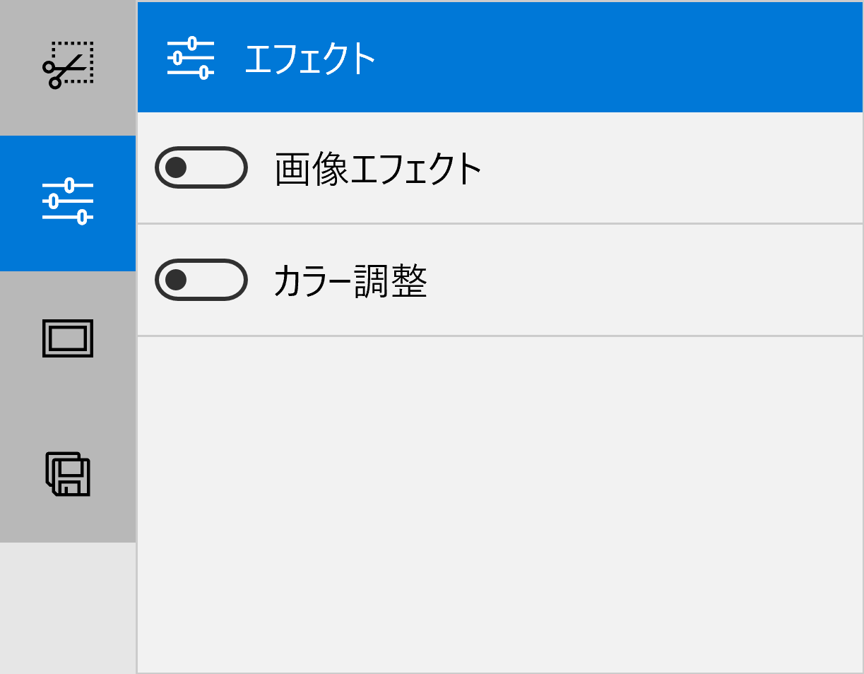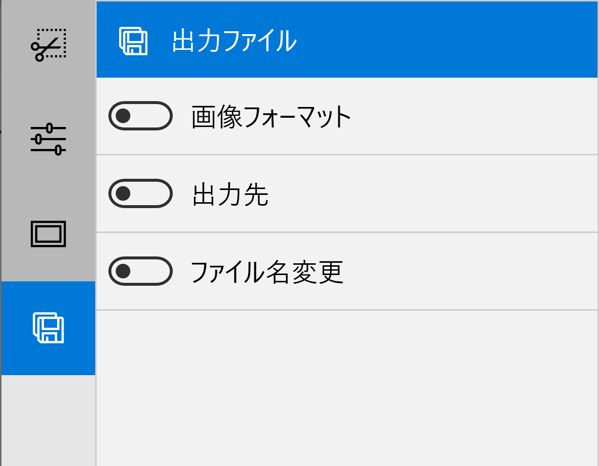 変形 / エフェクト / フレーム・背景 / 出力ファイル にカテゴリ分けし、ボタンの ON / OFF で表示を切り替えるようにしました。